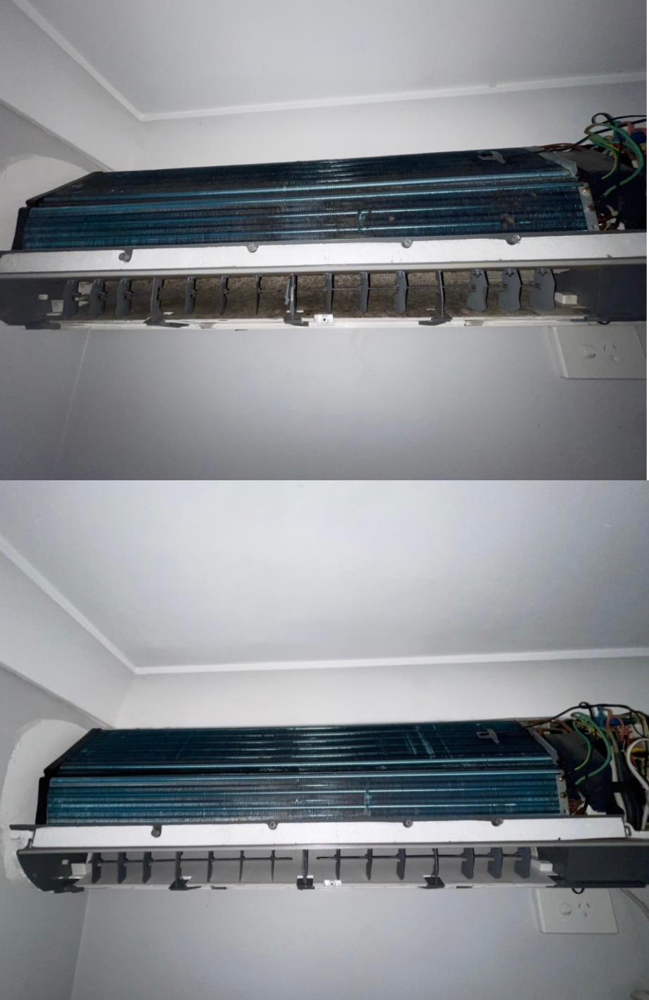 We start by carefully taking the unit apart and securing a catchment bag to catch runoff. Then we apply our eco-friendly coil cleaner and antimicrobial treatment, using a mix of tools to target the mould, dust and bacteria hiding deep inside. From there, we pressure wash the evaporator coils, filters and external casing to bring your system back to its best. Once everything’s clean, we dry, reassemble and sanitise the unit using a hospital-grade disinfectant that leaves it safe, fresh and ready to go.